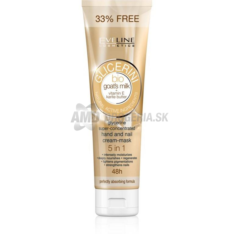 Glycerínový krém na ruky 5v1 s obsahom kozieho mlieka. Intenzívne hydratuje, hlboko vyživuje, regeneruje, zosvetľuje pigmentáciu, posilňuje nechty, dokonale sa vstrebáva, účinkuje po celých 48 hodín.