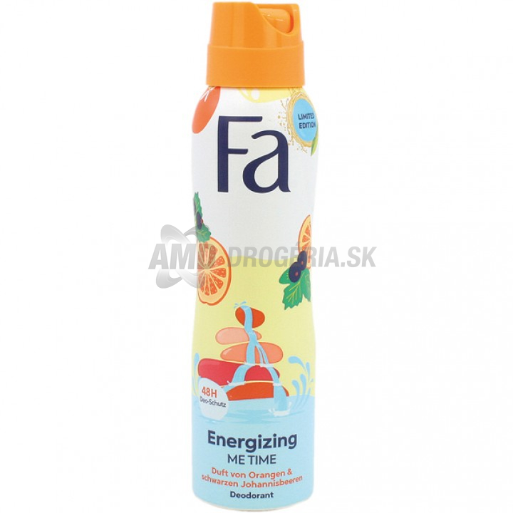FA Energizing Me Time deospray 150ml Deodorant Energizing Me Time je určený pre všetky typy pokožky. Obsahuje špeciálne zloženie, ktoré dokonale eliminuje nepríjemný zápach až na 48 hodín. Obsahuje tiež vegánsku receptúru, ktorá má 99% prírodných zložiek, ktoré sú šetrné ku vašej pokožke. Dokonale hydratuje a vyživuje vašu pokožku. Poskytuje jej príval energie a sviežosti. Nezanecháva škvrny a fľaky na oblečení. Neobsahuje alkohol a nedráždi pokožku. Zanecháva príjemnú a sviežu vôňu pomaranča a ríbezlí, ktorá Vás bude sprevádzať po celý deň. Objem balenia: 150ml, NEBEZPEČENSTVO: Mimoriadne horľavý aerosól.Uchovávajte mimo dosahu detí.Chráňte pred horúčavou, horúcimi povrchmi, iskrami, otvoreným plameňom a inými zápalnými zdrojmi. Zákaz fajčenia.Nestriekajte na otvorený oheň ani iný zdroj zapálenia.Neprepichujte ani nespaľujte, ani po použití.Chráňte pred slnečným žiarením. Nevystavujte teplotám nad 50 °C/122 °F