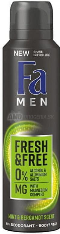 FA Men Fresh & Free Mint & Bergamont deospray 150ml Dezodorant Fresh & Free Mint & Bergamont určený pre mužov, ktorý majú radi aktivitu. Eliminuje nepríjemný zápach až na 48 hodín. Obsahuje komplex horčíka, ktorý je účinnejší v regulovaní zápachu tak, že obmedzuje rozmožovanie baktérií v podpazuší. Deodorant je šetrní ku Vašej pokožke. Zanecháva príjemnú a sviežu vôňu mäty a bergamontu, ktorá Vás bude sprevádzať po celý deň. Neobsahuje žiadne hlinikové soli. Objem balenia: 150ml