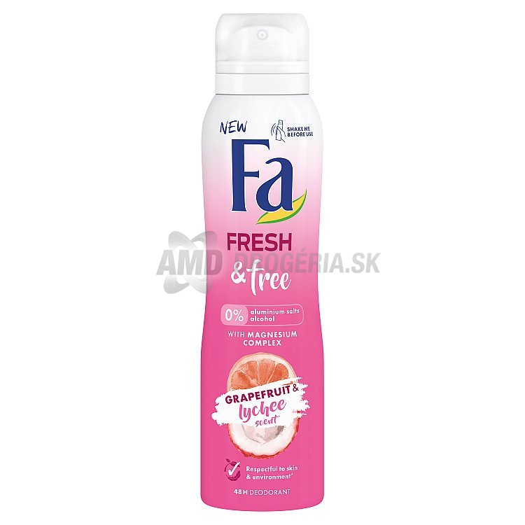 Dezodorant Fa Fresh & Free s vôňou grepu a liči. Objavte sviežosť prírody so 48 h dezodorantom s vôňou grepu a liči. - Až 48 h dlhotrvajúca ochrana - S komplexom horčíka pre efektívnu ochranu pred zápachom a antibakteriálny účinok - Zabraňuje škvrnám - Veľmi hebký a jemný na pokožku po holení - Rešpektuje životné prostredie: s viac ako 80 % prírodne rozložiteľnými ingredienciami v receptúre a 25 % recyklované hliníkové nádoby - Dermatologicky testované, vegánska receptúra