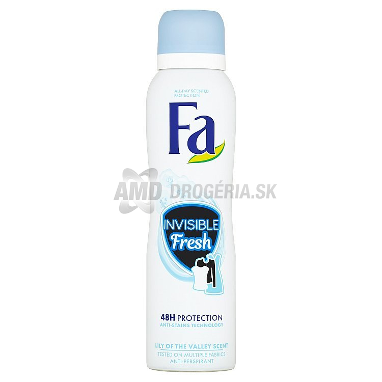 Antiperspirant Fa Invisible Fresh s vôňou konvalinky a technológiou proti škvrnám. Až 48h ochrana bez alkoholu proti potu a pachu. Objavte osviežujúcu vôňu konvalinky s antiperspirantom Fa proti škvrnám a s vegánskou receptúrou a už sa viac nestrachujte o škvrny na vašom oblečení! Zažite pocit smelosti a ochrany počas aktívneho dňa.