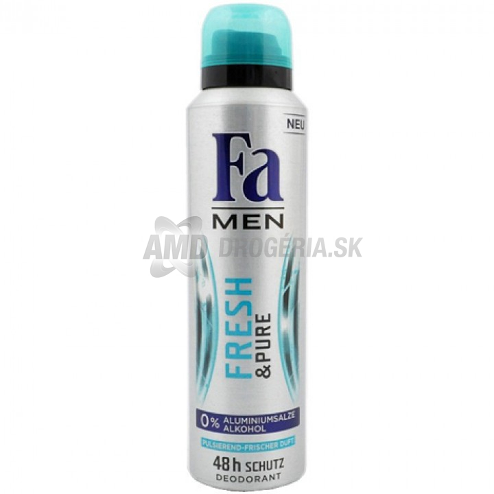 Fa Men Fresh & Pure deospray 150 - ochrana až 48h, 0% hliníkových soli, 0% alkoholu, pulzujúca svieža vôňa, spoľahlivá ochrana proti telesného pachu, príjemný svieži pocit pre pokožku, jemný i po holení, antibakteriálne.