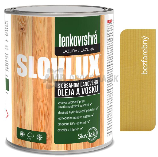 Slovlux Tenkovrstvá lazúra na drevo, bezfarebná, je ochranná a dekoratívna farebná lazúra na báze ľanového oleja určená na vnútorné a vonkajšie použitie. Tento produkt je vhodný na úpravu rôznych drevených povrchov, vrátane chát, okien, podláh, plotov, balkónov, záhradného nábytku a altánkov.