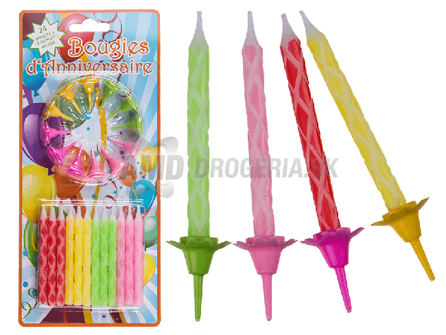 Rozmer: 0.5 x 5.8 cm, 4 farbách, 24 sviečok a 12 podstavcov.
