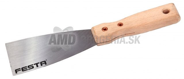 Špachtľa oceľová FESTA s drevenou rukoväťou. Ide o maliarsku špachtľu s brúseným oceľovým britom a drevenou nitovanou rukoväťou. Táto špachtľa sa zrejme používa na aplikáciu a rovnomerné rozotieranie farieb, lakov alebo iných povlakov na povrchy.