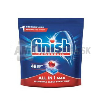 Tablety do umývačky riadu Finish All-In-1 MAX Regular 48 ks s účinnou Powerball guľôčkou uprostred účinne vyčistia umývačku riadu od mastnoty a nečistôt a poriadi sa aj so zaschnutými zvyškami jedla už pri nízkych teplotách. Riad získa čistotu a žiarivý lesk a zároveň budú chránené pred koróziou.