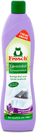 Frosch čistiaci krém s vôňou levandule a mletým prírodným vápencom odstráni akúkoľvek špinu v kuchyni a v kúpeľni. Keramické, smaltované, nerezové a sklenené povrchy zbaví nečistôt, mastnoty, zvyškov mydla a vodného kameňa. Navyše domácnosť prevonia príjemnou levanduľovou vôňou.