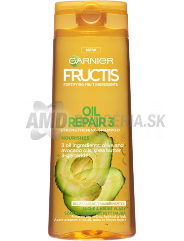 Šampón fructis oil repair 3, navrhnutý špeciálne pre suché a hrubé vlasy, obsahuje benefity 3 olejových zložiek: avokádového, olivového oleja a bambuckého masla, spolu s aktívnou látkou známou svojimi vyživujúcimi vlastnosťmi - 3-glyceridom. Vlasom tak poskytuje regeneráciu a hebkosť.