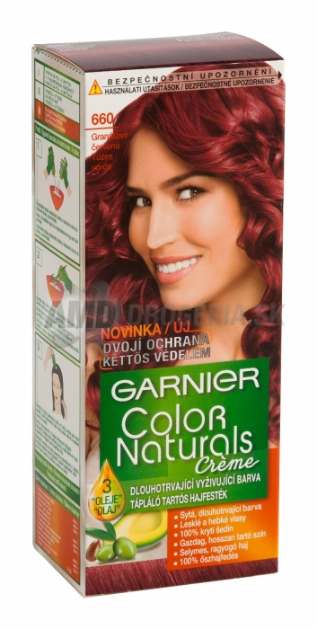 GARNIER COLOR NATURALS 660- GRANÁTOVO ČERVENÁFarbiaci krém Garnier Color Naturals je obohatený o prírodný olivový olej, avokádo a karité. Olivový olej preniká spoločne s farbiacimi pigmentmi hlboko do štruktúry vlasov, a tak počas farbenia sa zároveň stará o vlasy! A výsledok? Intenzívne žiarivá, sýta farba a zdravé farbené vlasy.Zanecháva ich výnimočne hebké na dotyk, neuveriteľne lesklé a nádherné na pohľad. Farbiaca zmes sa nanáša štetcom, príjemne vonia ovocnou vôňou a vďaka jedinečnému krémovému zloženiu pri aplikácii nesteká.Balenie:1 fľaštička oxidačného činidla . . 60ml1 tuba s farbiacim krémom . . 40 ml1 záverečná starostlivosť . . 10ml1 pár rukavíc, 1 návod na použitie