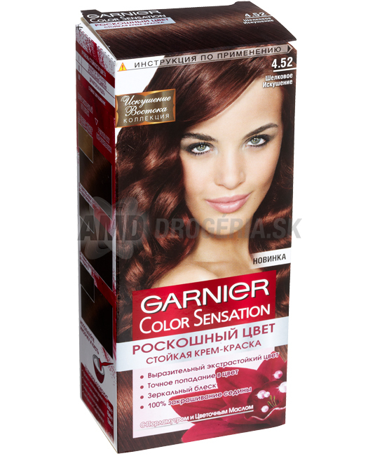 GARNIER COLOR SENSATION 4.52- INTENZÍVNA HNEDÁPrvá farba na vlasy od Garnier s intenzívnymi pigmentmi a kvetinovými olejmi pre zmyselnú farbu! Základná filozofia Garnier je spätá so starostlivosťou o pleť založenou na prírode. Inovované produkty boli vždy inšpirované prírodou, jedine tak môžete efektívne starať o vaše telo aj pleť v harmónii.Podľa Garnier sa týka krása nás všetkých. Každý vyžaruje svoju prírodnú krásu a každý z nás má moc, aby jeho krása zažiarila. Garnier je pre sebaisté ženy, ktoré chcú podporiť svoj ??vzhľad. Tým, že žena o seba stará, rastie aj jej vnútorná krása. Znakom krásy je šťastná a vyrovnaná žena!Precízne dlho trvajúce farbaPerfektný lesk 100% krytie šedínZmyselná farba: Špeciálne zloženie obsahuje intenzívne pigmenty.Farba je pôsobivá, precízne a dlhotrvajúci.100% kryje šediny.Perleťový lesk: Obohatené o perleť a kvetinové oleja, pre intenzívne farebné efekty a perfektný lesk.Pôžitok pre zmysly: Jemná kvetinová vôňa robí z farbenia vlasov pôžitok pre zmysly. Záverečná starostlivosť obohatená o perleť obalí a vyživuje vlasové vlákna.Pre žiarivé vlasy, jemné na dotyk.