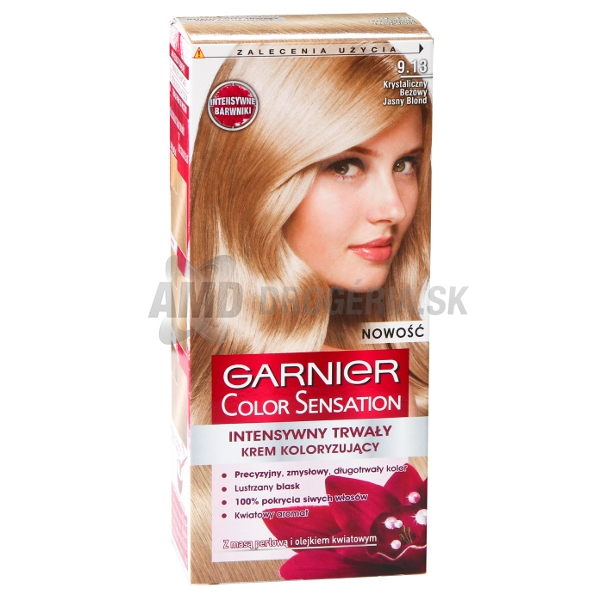 GARNIER COLOR SENSATION 9.13- VEĽMI SVETLÝ BLOND DÚHOVÝPrvá farba na vlasy od Garnier s intenzívnymi pigmentmi a kvetinovými olejmi pre zmyselnú farbu! Základná filozofia Garnier je spätá so starostlivosťou o pleť založenou na prírode. Inovované produkty boli vždy inšpirované prírodou, jedine tak môžete efektívne starať o vaše telo aj pleť v harmónii.Podľa Garnier sa týka krása nás všetkých. Každý vyžaruje svoju prírodnú krásu a každý z nás má moc, aby jeho krása zažiarila. Garnier je pre sebaisté ženy, ktoré chcú podporiť svoj ??vzhľad. Tým, že žena o seba stará, rastie aj jej vnútorná krása. Znakom krásy je šťastná a vyrovnaná žena!Precízne dlho trvajúce farbaPerfektný lesk 100% krytie šedínZmyselná farba: Špeciálne zloženie obsahuje intenzívne pigmenty.Farba je pôsobivá, precízne a dlhotrvajúci.100% kryje šediny.Perleťový lesk: Obohatené o perleť a kvetinové oleja, pre intenzívne farebné efekty a perfektný lesk.Pôžitok pre zmysly: Jemná kvetinová vôňa robí z farbenia vlasov pôžitok pre zmysly. Záverečná starostlivosť obohatená o perleť obalí a vyživuje vlasové vlákna.Pre žiarivé vlasy, jemné na dotyk.