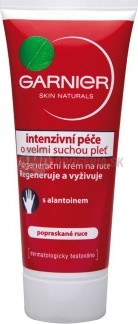 GARNIER KRÉM VEĽMI SUCHÉ RUKY 100 ML Zloženie:alantoín - známy svojimi regeneračnými schopnosťami ošetruje popraskanú pokožkuglycerín - chráni ruky neviditeľným filmom. Ochranná filtračné zložka zabraňuje predčasnému starnutiu pokožky na rukách.Výsledky:pravidelným používaním regeneračného krému s alantoínom sa popraskaná pokožka uzdraví a upokojí, bude opäť jemná a pružná.