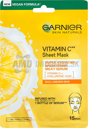 Získajte žiarivú pleť za pomoci vitamínu C! Textilná pleťová maska Garnier Skin Naturals Vitamin C** vďaka svojej textúre dokonale priľne na pleť a umožní tak pleti efektívnejšie prijať účinné látky. Látková maska je napustená super hydratačným a rozjasňujúcim mliečnym sérom, ktorý zodpovedá 1 fľaštičke bežného séra. Vegánska formula s vitamínom C a kyselinou hylurónovou unavenú pleť krásne rozžiari, hydratuje, zjednotí jej tón a dodá jej zdravý vzhľad. Stačí len 15 minút a vaša pleť bude svieža a oddýchnutá ako nikdy predtým! Doprajte svojej pleti beauty kúru s pleťovou maskou Garnier Vitamin C**!