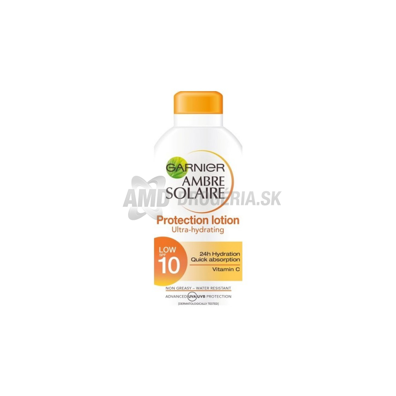 GARNIER OPAĽOVACIE MLIEKO LIGHT SILKY OF10 200 ML Garnier Ambre Solaire Opaľovacie mlieko s ochranou OF10 poskytuje nízku ochranu pred slnečným žiarením. Je určené pre tmavšiu, už opálenú pokožku.Poskytuje odolnú ochranu pred UVA/UVB. Zloženie krému je obohatené o vitamín C. Pri pravidelnom používaní dlhodobo posilňuje prirodzenú ochranu proti slnkom vyvolaným poškodeniam pokožky.Hydratuje a chráni pred vysúšaním a dodáva pokožke prirodzený lesk a výživu. Má nemastné, ľahko sa vstrebávajúce zloženie. Je vodeodolné. Dermatologicky testované.