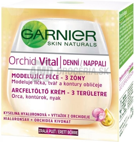 GARNIER ORCHID VITAL DENNÝ 50 ML Táto starostlivosť obsahuje dve prírodné aktívne látky špeciálne vybrané pre zrelú pleť.obsah:výťažky z orchidey - obnovujúci bunkovú vitalitubioproteíny zo sóje - stimulujú tvorbu kolagénu a elastínu.výsledky:pleť je viac hydratovaná + 38,6%kontúry tváre sú menej ochabnuté - 15,4%Zosvetlenie pigmentových škvŕn: 76%Ako používať:používajte tento vyživujúci krém každý deň na pokožku tváre a krku.