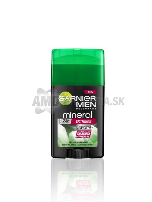 GARNIER STICK MEN MINERAL EXTREME 40 MLGarnier Men Mineral Extreme predstavuje najúčinnejšiu ochranu proti poteniu od Garnier. Jeho účinnosť bola preukázaná za extrémnych podmienok.72 hodín absolútnej ochrany proti poteniu pri športe, strese, teple.Minerálultra-absorpčný minerál vulkanického pôvoduje schopný absorbovať vlhkosť až do päťnásobku svojho vlastného objemuúplne garantuje suché podpazušie ihneď po aplikácii72h účinnosť72h sviežosť - 72h bez potu - 72h bez pachuPokožka voľne dýcha!Minerál stimuluje dezodoračnú účinnosť, zároveň však neblokuje póry. Výsledkom je suchá, nelepkavá pokožka a podpazušie, ktoré voľne dýcha!