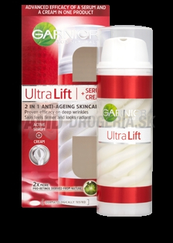 GARNIER ULTRALIFT KRÉM+SÉRUM 50 ML Dojprajte si účinnú starostlivosť proti vráskam 2v1 pre každý deň!Garnier Skin Naturals Ultra Lift Komplexná starostlivosť proti vráskam 2v1 - to je Garnier Ultra Lift Cream + Serum 2v1, ktorý spája v sebe starostlivosť dvoch produktov, nevyhnutných pre boj s príznakmi starnutia pleti:1. Krém - je obohatený o 2x viac Pro-Retinolu inšpirovaného prírodou, pre optimálny účinok2. Aktívne Sérum - účinne bojuje proti vráskam, pleť viditeľne rozjasňuje, spevňuje a dodáva jej vitalitu.Ako každý výrobok Garnier Skin Naturals, aj Garnier Ultra Lift Cream + Serum používa aktívne prírodné látky, ktoré získava starostlivým výberom a špeciálnymi technologickými postupmi, ktoré zaručujú výrobkom kvalitu a čistotu. Dermatologicky testované.Výsledok: účinnosť výrobku je pozorovaná už po 10 dňochpleť je vypnutá, vyzerá mladšia, hlboké vrásky sú redukované, pleť je oveľa elastickejšia, jas pleti je oživený a pleť žiarivejšia. Krém je dporúčaný pre vek od 35rokov - 60rokov.