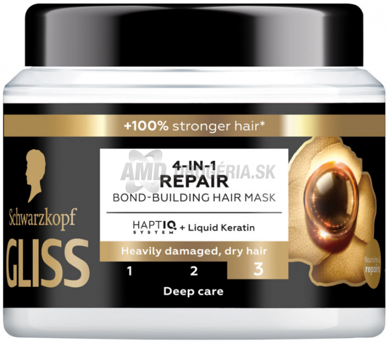 Veľmi poškodené vlasy môžu postupne strácať keratín, čo vedie k oslabenému vzhľadu vlasovej štruktúry. Na obnovu strateného keratínu je potrebná intenzívna starostlivosť. Gliss regeneračná maska s keratínom kombinuje systém HAPTIQ a tekutý keratín pre hĺbkovú regeneráciu a lesk vlasov. Táto maska s ľahkou krémovou textúrou poskytuje intenzívnu výživu a zanecháva vlasy silné a žiarivé. Rekonštruuje vlasovú štruktúru a zvyšuje ich odolnosť až 10-krát****.
