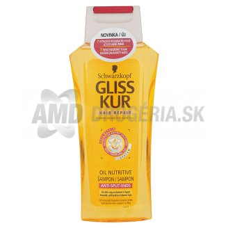 Popis:Intenzívny regeneračný šampón Gliss Kur Oil Nutritive obsahuje 1/3 regeneračnej kúry. Vlasy umýva ako šampón a ošetruje ako kúra. Receptúra so SCAN REPAIR komplexom chráni vlasy pred lámaním, znižuje tvorenie rozštiepených končekov už pri prvom použití a vlasom dodá až 70% viac lesku.Použitie:Jemne vmasírujte do mokrých vlasov. Dôkladne opláchnite.