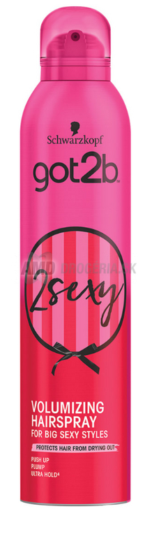 Nadýchaný look po celý večer! Lak na objem vlasov 2Sexy od got2b dodá vašim vlasom objem už od korienkov. Vlasy krásne vydvihne a následne dlhodobo zafixuje. Ošetrujúca receptúra zabraňuje ich vysušovaniu, nezaťažuje a nelepí. Jemné vlasy získajú na objeme a pevnosti. Maximálny objem, dokonalé spevnenie a oslnivý lesk! Vyskúšajte novinku – lak na vlasy got2b 2Sexy a cíťte sa atraktívne!