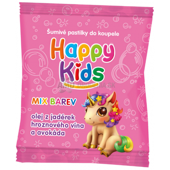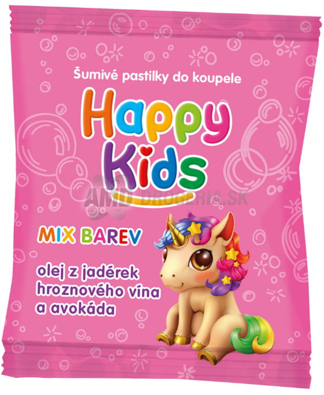 Šumivé pastilky do kúpeľa Happy Kids prinesú do vašich kúpeľov radosť a zábavu. S ich pomocou sa kúpanie stane zábavným zážitkom pre deti. Tieto pastilky obsahujú olej z jadierok hrozna a avokádový olej, ktoré hydratujú a zjemňujú detskú pokožku, zanechávajúc ju jemnou a hebkou.