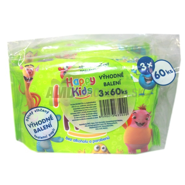 Happy Kids Detský vlhčený toaletný papier 3 x 60ks Jemné zloženie a hebké obrúsky šetrné k detskej pokožke pre každodennú hygienu.