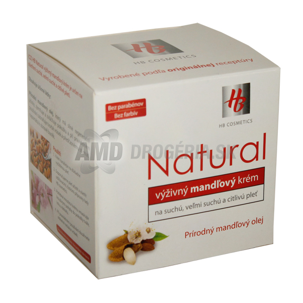 HB Cosmetics Natural výživný mandľový krém je vysoko výživný, vhodný na ošetrenie suchej, veľmi suchej a citlivej pleti, s obsahom prírodného mandľového oleja, ktorý má silné regeneračné účinky a zároveň chráni pleť pred nepriaznivými vplyvmi prostredia.
