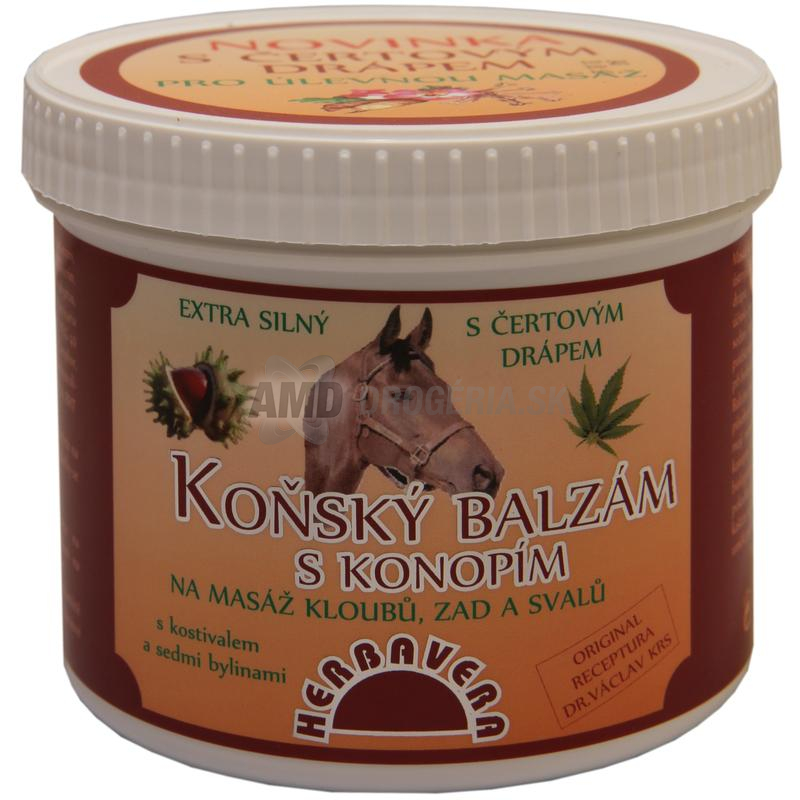 Konský balzam s kanabisom, kostihojom, gaštanom konským a siedmich bylinami má skvelé účinky na uvoľnenie pohybového ústrojenstva. Je určený k masáži pri bolestiach chrbta, šliach, svalov či lokálnych opuchoch. Má mierne chladivý účinok, vyvoláva intenzívne osvieženie a prekrvenie. Navyše s obsahom konopného oleja, ktorý má blahodárne účinky na pokožku a jej regeneráciu.