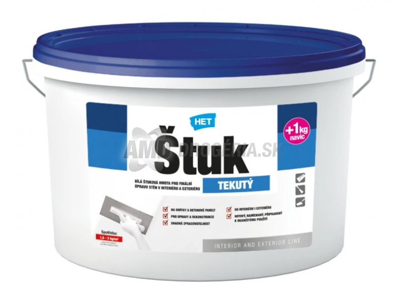 Het Štuk tekutý je hotová stierková hmota, ktorá je ideálna na finálne úpravy vnútorných stien. Je určené na okamžité použitie na betónové panely alebo na jadrové omietky. Vďaka svojej bielej farbe je vhodná aj na rekonštrukcie panelových bytov a opravy omietok pred maľovaním. Môže tiež nahradiť estetickú funkciu náteru v menej náročných objektoch.
