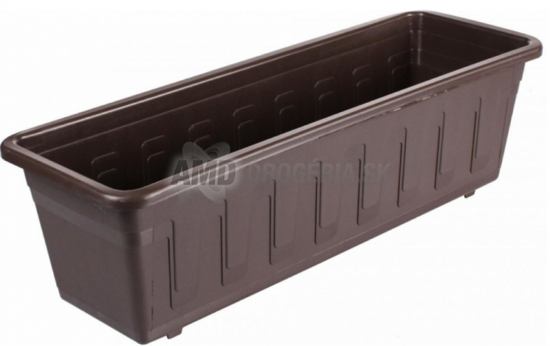 Tento hnedý matný plastový kvetináč je ideálny pre balkónové rastliny, bylinky a sezónne aranžmány v interiéri aj exteriéri. Má obdĺžnikový tvar s jemným konickým rozšírením a dvojitými vlnkami po stranách. Horný okraj je silnejší a zahnutý smerom von. Rozmery sú šírka 50 cm, výška 14 cm a hĺbka 17 cm.