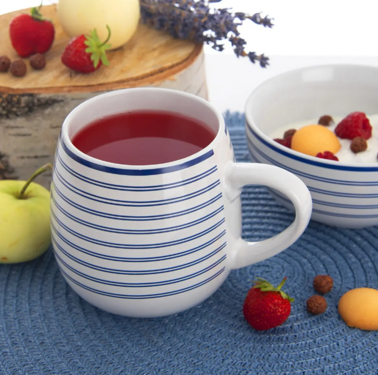 Hrnček "Blue design" s objemom 0,58 litra je ideálnym spoločníkom na dlhé popoludňajšie chvíle s horúcim čajom, bylinkovým nálevom alebo lahodnou bielou kávou. Tento keramický hrnček je vybavený uškom, čo zabezpečuje pohodlné uchopenie a príjemný pitný zážitok.