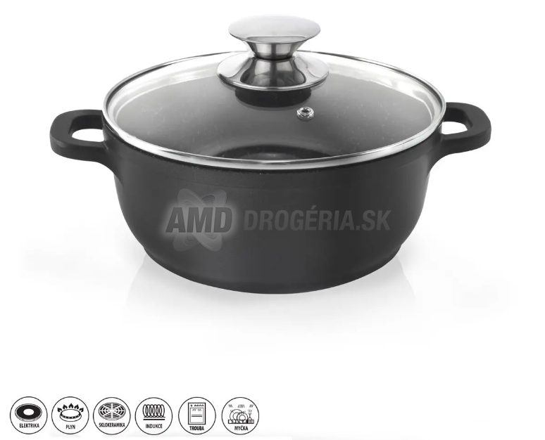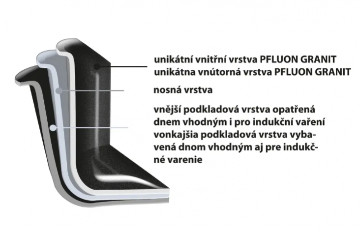 Hrniec je vyrobený z hliníka s vynikajúcim nepriľnavým povrchom PFLUON GRANIT a disponuje profilovaným dnom, ktoré zabezpečuje rovnomerné rozloženie tepla. Okrem toho je vybavený sklenenou pokrievkou a užitočnými rukoväťami na ľahké manipulovanie.