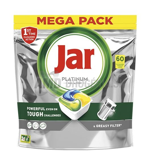 Čistotu, vôňu aj lesk riadu Vám zaistia tablety do umývačky Jar Platinum All in One. Sú ľahko rozpustné vo vode a jednoducho tak umyjú všetku nečistotu k vašej plnej spokojnosti. Účinkujú aj pri nízkej teplote. Odolne odstraňujú škvrny, pečlivo odmasťujú a zanechávajú úžasný lesk. Zároveň chráni sklo aj striebro a zabraňuje vzniku vodného kameňa. Tablety nerozbaľujeme, len vložíme do umývačky do určenej priehradky a umývačku zapneme. Po uplynutí doby umývania bude všetko žiariť čistotou.