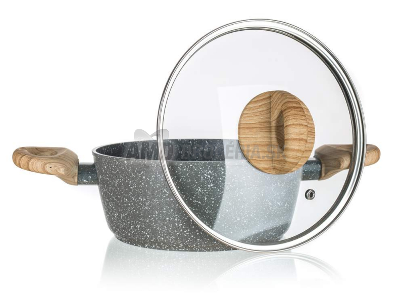 Hliníkový liaty hrniec so sklenenou pokrievkou NATURAL STONE s nepriľnavým povrchom, 20 x 8,5 cm, kamenný vzhľad, hrúbka steny 3 mm, plne indukčné dno s potlačou, rukoväť s imitáciou dreva. Nepriľnavý povrch je veľmi tvrdý a odolný proti poškriabaniu.