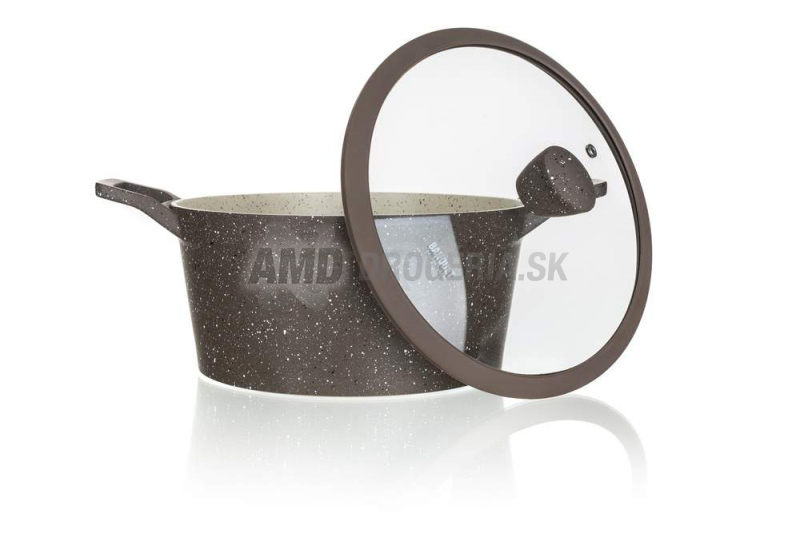Hliníkový liaty kastról Marrone s nepriľnavým povrchom o priemere 20 cm, plne indukčné dno, sklenená pokrievka, knob so silikónovým povrchom, dekor granitový hnedý.