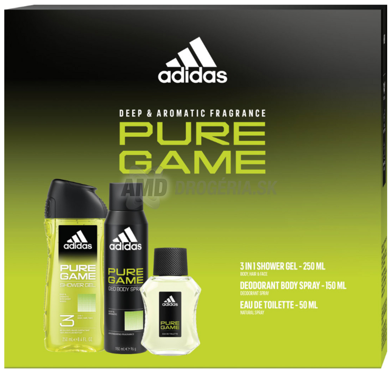 - Adidas Pure Game toaletná voda (50 ml) : Táto toaletná voda je hlavným produktom sady a ponúka vôňu, ktorá je inšpirovaná Juhoafrickou republikou. Kombinuje intenzívne drevité tóny s mužným a iskrivým charakterom. Toaletná voda je vhodná na denné nosenie a pomáha cítiť sa dobre a dobre.