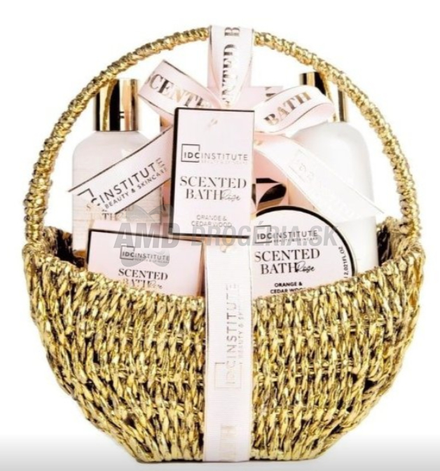 IDC Institute "rafiový košík" Gold s vôňou pomaranča a cédrového dreva je štýlovou darčekovou sadou, ktorá poskytuje komplexnú starostlivosť o telo. Toto darčekové balenie obsahuje niekoľko produktov s exkluzívnou vôňou, ktoré spravujú z každej kúpeľne alebo starostlivosti o telo malý luxusný zážitok. Tu sú jednotlivé položky v rafiovom košíku:
