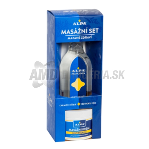 Potešte svojich blízkych skvelým darčekom! Darčekové balenie ALPA Masážny set obsahuje produkty so širokým spektrom použitia v domácnosti. Liehový bylinkový roztok ALPA francovka je vhodný na zmiernenie kĺbových a svalových bolestí, alebo pri chrípke či prechladnutí. Možné použiť na kloktanie a inhaláciu. Po zriedení vodou ako obklad. Masážny krém ALPA je univerzálny krém pre masáž a uvoľnenie pohybového aparátu. Má vysoký obsah minerálneho oleja. Vytvára na povrchu pokožky klzký film, ktorý zaručuje príjemné trenie. Kozmetická sada ALPA Masážny set ako darček vždy poteší!