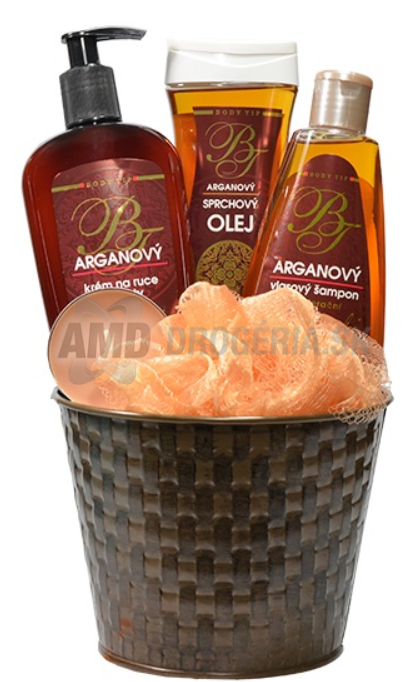 KAZETA BODY TIP ARGAN SPRCHOVÝ OLEJ 300ML + ŠAMPÓN NA VLASY 250ML + KRÉM NA RUKY 300ML + MASÁŽNA HUBKA + VONNÁ SVIEČKA
