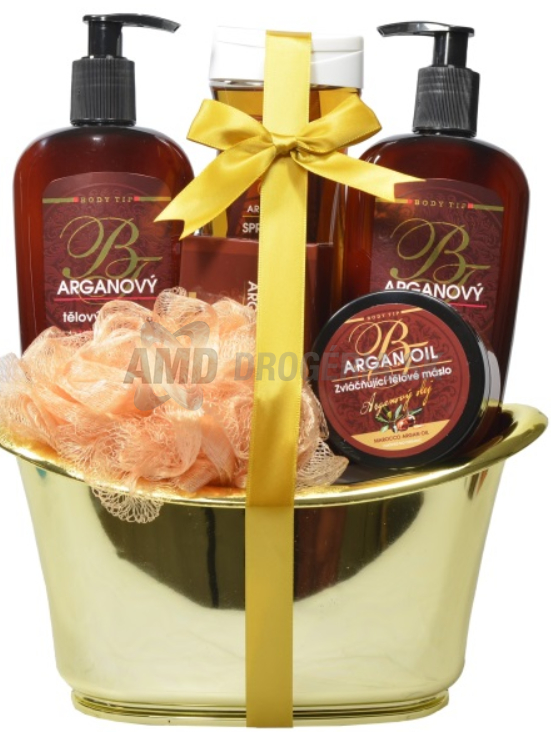 KAZETA BODY TIP ARGAN SPRCHOVÝ OLEJ 300ML + TELOVÝ BALZAM 300ML + KRÉM NA RUKY 300ML + TELOVÉ MASLO 100ML + TUHÉ MYDLO 100G + MASÁŽNA HUBKA