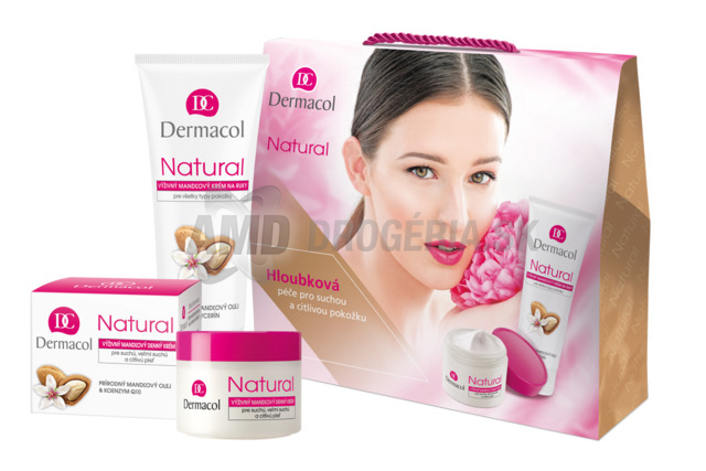 Darčeková súprava DERMACOL Natural poteší každú ženu, ktorá dbá na zdravý a krásny vzhľad svojej pleti. Súprava obsahuje pleťový mandľový krém a mandľový krém na ruky a nechty. Vysoko výživný denný krém DERMACOL Natural s objemom 50 ml hĺbkovo ošetruje suchú, veľmi suchú a citlivú pleť. Vyniká silnými regeneračnými účinkami. Pomáha obnovovať bunky, predchádza predčasnému starnutiu pleti a znižuje výskyt vrások. Upokojuje podráždenie a zmierňuje pocity pnutia. Pokožku zvláčňuje, obnovuje jej ochrannú bariéru a chráni pred voľnými radikálmi a negatívnymi vplyvmi prostredia. Zanecháva ju sviežu, jemnú, pevnú a pružnú. Jeho zloženie je obohatené o prírodný mandľový olej a koenzým Q10. Prípravok je dermatologicky testovaný.
