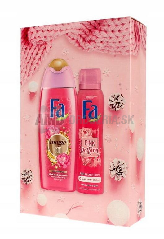 Darčeková kozmetická súprava Fa Magic Oil Pink Jasmine vás zahalí do oblaku sladkej vône kvetín. Set obsahuje sprchový gél Fa Magic Oil Pink Jasmine 250 ml a dezodorant Fa Pink Passion 150 ml.