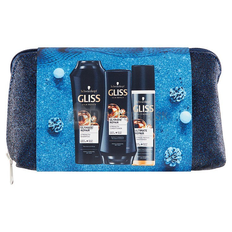 Potešte svojich blízkych skvelým darčekom! Darčeková kazeta Schwarzkopf Gliss Ultimate Repair obsahuje produkty pre dokonalú starostlivosť pre veľmi poškodené, suché vlasy. Šampón na vlasy Gliss Ultimate Repair s tekutým keratínom a čiernou perlou zaistí až o 90 % viac odolnosti. Kondicionér Gliss Ultimate Repair obsahuje tekutý keratín a čiernu perlu pre ľahkú rozčesateľnosť a až o 90 % väčšiu odolnosť a lesk. Regeneračný expres kondicionér Gliss Ultimate Repair s obsahom tekutého keratínu a čiernej perly je ideálny pre okamžite ľahšie rozčesanie a regeneráciu. Nechajte sa rozmaznávať a doprajte svojim vlasom dokonalú starostlivosť v podobe darčekového balenia Schwarzkopf Gliss Ultimate Repair!