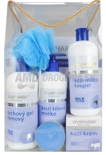 KAZETA KOZIE MLIEKO PLEŤOVÝ KRÉM 50ML + SPRCHOVÝ GÉL 400ML + MLIEKO DO KÚPEĽA 400ML + TELOVÉ MLIEKO 400ML + VONNÁ SVIEČKA + MASÁŽNA HUBKA