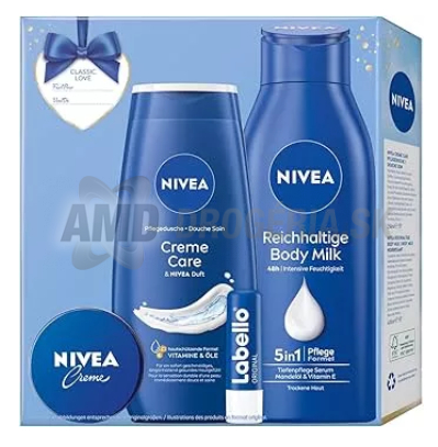 KAZETA NIVEA CLASSIC LOVE CREME CARE SPRCHOVÝ GÉL 250ML + TELOVÉ MLIEKO 400ML +KRÉM 30ML + BALZAM NA PERY LABELLO 4,8G