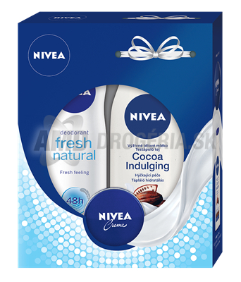 Darčeková kazeta, ktorá poteší každú ženu! Táto s názvom Cocoa Indulging & Creme je určená pre suchú pokožku a obsahujezákladné prípravky pre starostlivosť o celé telo.Vnútri nájdete výživné telové mlieko Cocoa Indulging, doplnené antiperspirantom Fresh Natural v spreji. Nechýba ani cestovné balenie klasického krému Nivea. Rad Nivea Cocoa Indulging zaisťuje suchej pokožke celého telaintenzívnu výživu, hydratáciu aj ochranu proti voľným radikálompo celý deň. Obsahuje kakaové maslo a kokosový olej. Kakaové maslo je prírodným antioxidantom, ktorý chráni, zvláčňuje, vyživuje a hydratuje pokožku.Kokosový olej predchádza kožným ochoreniam a zanecháva pokožku žiarivú a sviežu.Nivea Cocoa Indulging
