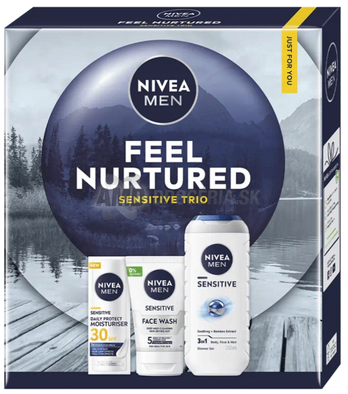 Darčekové balenie NIVEA MEN Sensitive prináša kompletnú starostlivosť pre citlivú mužskú pokožku. Obsahuje sprchový gél 3 v 1 s výťažkami z bambusu, ktorý čistí telo, tvár aj vlasy a zanechá sviežu pánsku vôňu. Jemný čistiaci gél na tvár s harmančekom, vitamínom E a provitamínom B5 hĺbkovo čistí pleť bez vysušenia. Denný krém Sensitive SPF 30 chráni pred škodlivým UVA a UVB žiarením, zabraňuje predčasnému starnutiu a vďaka ľahkej textúre sa okamžite vstrebáva bez mastného pocitu. Ideálny darček pre moderného muža, ktorý dbá na dokonalú starostlivosť o pleť.