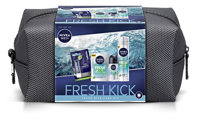 Nivea Men Fresh Kick voda po holení 100 ml + gél na holenie 200 ml + antiperspirant roll-on 50 ml + Labello balzam na pery 5,5 ml + etue, kozmetická sada pre mužov