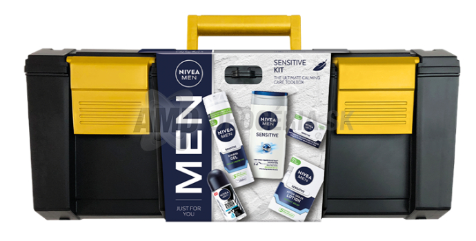 KAZETA NIVEA MEN KUFRÍK TOOLBO SENSITIVE KIT GÉL NA HOLENIE 200ML + SPRCHOVÝ GÉL 3V1 250ML + HYDRATAČNÝ KRÉM 50ML + ROLL ON 50ML + VODA PO HOLENÍ 100ML