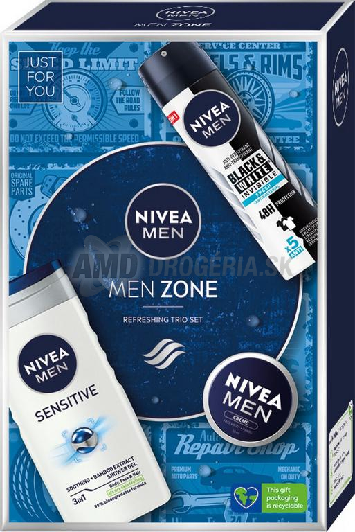 Doprajte svojim milovaným dlhotrvajúcu sviežosť a okamžitú úľavu pre podráždenú pokožku. Vďaka sprchovému gélu sa dá o citlivú a začervenanú pokožku starať už v sprche. Antiperspirant zaistí účinnú, ale k pokožke jemnú ochranu pred potením. A chýbať nesmie prvý krém, ktorý sme vyvinuli špeciálne pre mužskú pokožku. To je starostlivosť, na ktorú je spoľahnutie. Súprava obsahuje: Sprchový gél pre mužov Sensitiv e 250 ml Antiperspirant v spreji Invisible For Black & White Fresh Men (Anti-Perspirant For Men ) 150 ml Univerzálny krém pre mužov Men (Creme) 30 ml